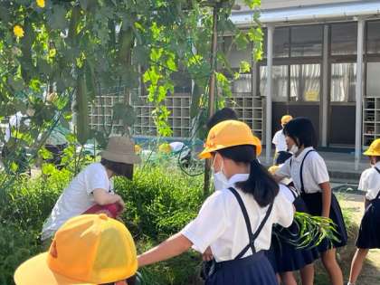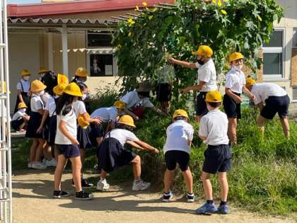 4年生がヘチマの畑の雑草を一生懸命に抜いてくれました。ヘチマの観察もしやすくなりますね。