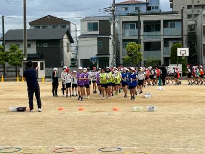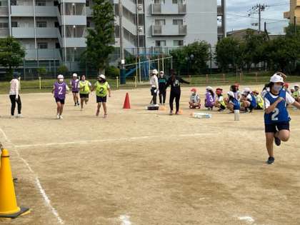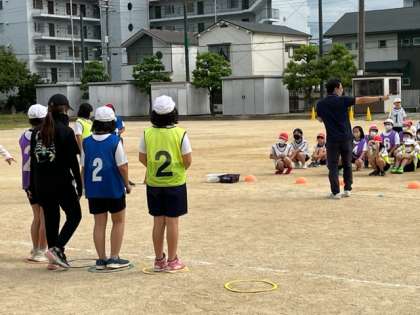 運動発表会で行う団体競技のリレーの練習です。並び方を確認してから実際に走ってバトン渡しの練習も行いました。