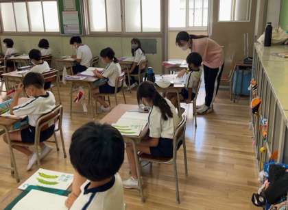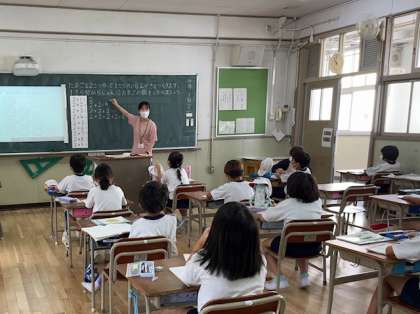 「たまごを2個使って一皿分の目玉焼きをつくるとき、一皿めから順にたまごの数を調べましょう」という問題をもとに、かけ算の考え方を学んでいきました。「2」の段の九九を先生から教えてもらい、みんなで声を出して読みあげました。