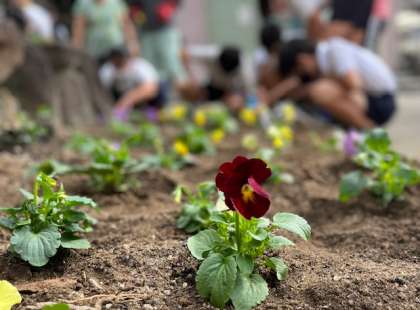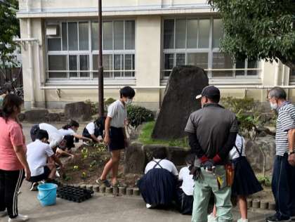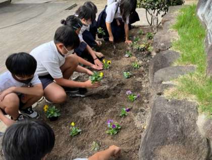 校門にある花壇に、栽培委員のみんながパンジーを植えてくれました。色とりどりの花がきれいに校門を飾ってくれています。さらに大きくなるよう、学校みんなで大切に育ててまいります。