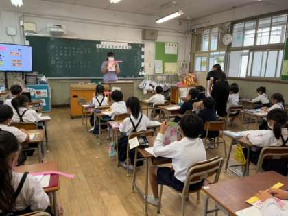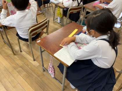 テープをつかって、本の横の長さと縦の長さを比べました。きちんと比べるためにはテープをどう使えばよいかを考えました。