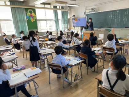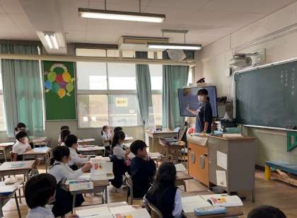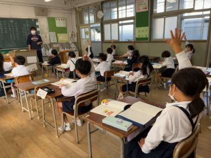 「サラダでげんき」というお話を読んで、順に登場する人物、動物に注目して、だれがどんなことを教えてくれたのかを見ていきました。みんな積極的に発言していました。
