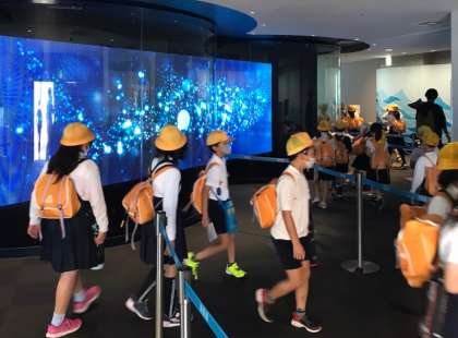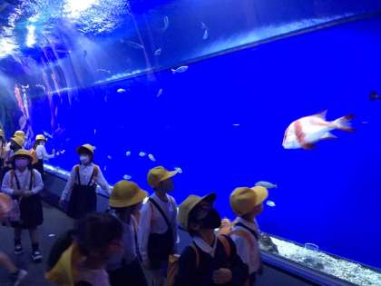 好天に恵まれたなか、3年生は海遊館へ出かけました。入館したとたんに、子どもたちは大興奮です。多くの学校が海遊館を訪れた様子で、思いのほか混雑はしていましたが、子どもたちは楽しく海や川に住む生き物を観察できたようです。