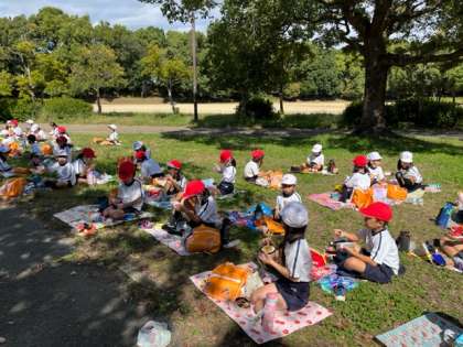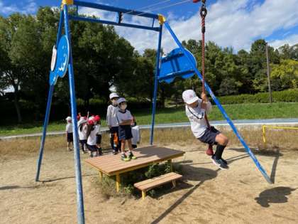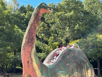 次に「恐竜広場」へ移動してお弁当をひろげました。昼食後は、大きな恐竜の遊具やターザンロープなどで楽しいひと時を過ごしました。