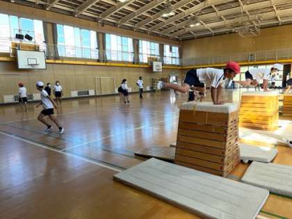 6年生の跳び箱の様子です。みんな一段一段と、より高い跳び箱にチャレンジしている姿がかっこいいです。