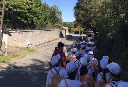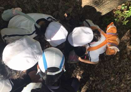 2年生の校外学習の様子です。寝屋川公園に到着し、さっそく歩きながらの「秋見つけ」を楽しみました。トイレ休憩の時間も、どんぐり拾いに夢中です。きのこも見つけて興味津々です。