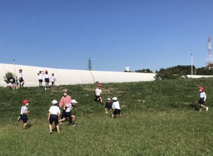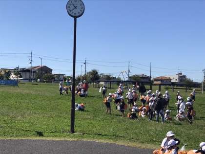 公園をぐるっと回って、遊具のある広場へやってきました。ここで少し休憩です。拾ったどんぐりを数えたり、虫探しをしたり、楽しそうです。休憩が終わり、広場で活動です。鬼ごっこも広い場所で楽しそうでした。