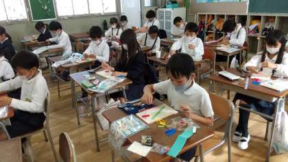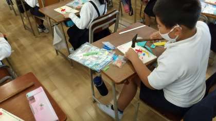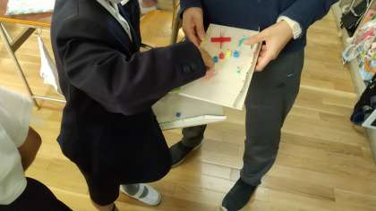 金づちをもって板に釘を打ちつけて、遊具をつくりました。みんな工夫をしてできあがった作品にビー玉を転がして楽しみました。