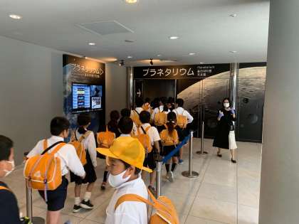 4年生の校外学習は大阪市立科学館です。到着して、まずプラネタリウムに入りました。係員の方から、太陽、月、星座についての話を映像を見せてもらいながらうかがいました。