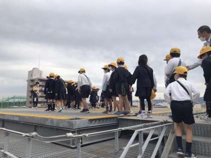 3年生は社会見学として鶴見消防署を訪問しました。消防署に着いて、二手に分かれての見学です。署内を順にまわり、普段は立ち入れないヘリポートなども見せてもらいました。