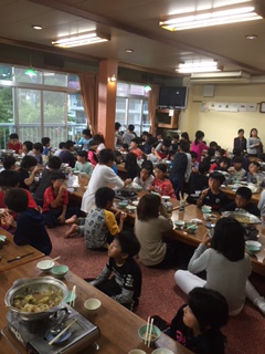 林間学習一日目の夕食はすき焼きです。みんなで協力して作ります。しょうゆやさとうで味付けをして、火加減も自分たちで調整します。おいしくできたでしょうか。