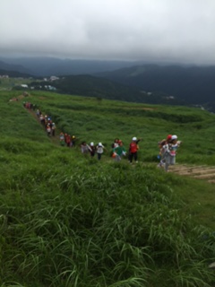 頂上に着いても霧が出ています。景色は十分見渡せませんでしたが、暑さで体調を崩す子がいなかったのは幸いでした。