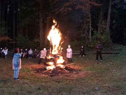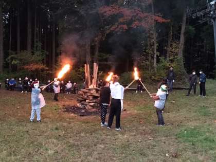 キャンプファイヤーのスタートです。火の神から火を受け取り、火が灯りました!!