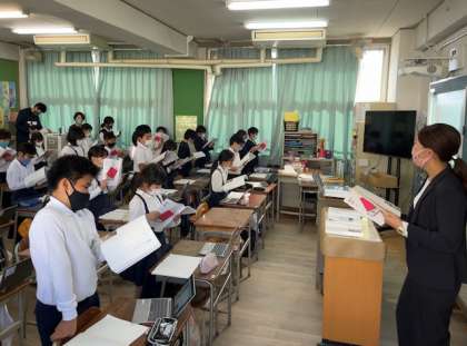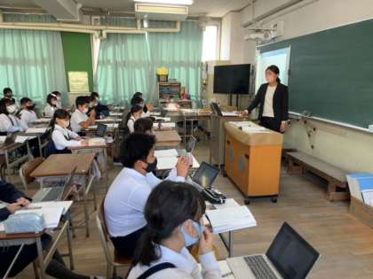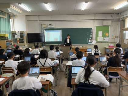 物語文の「ごんぎつね」をもとに、中心人物とほかの人物との関りについて考え、感想を伝え合いました。自分の考えを示すのにタブレットを活用し全体で共有しました。