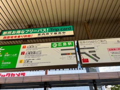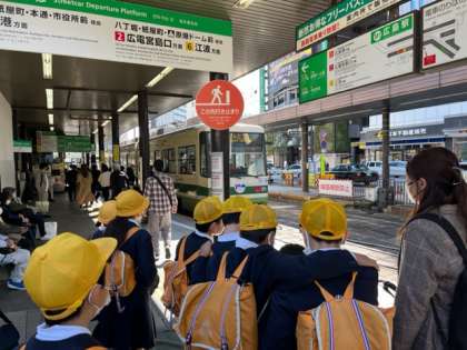 広島電鉄、通称「ひろでん」に乗りこみます。今ではめずらしい路面電車です。平和記念公園へと出発です。