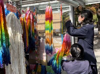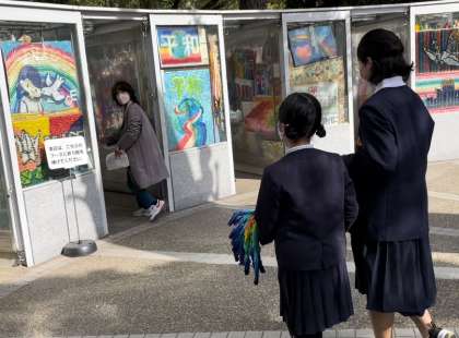 今津小学校のみんなでつくった千羽鶴を平和への願いを込めて、「原爆の子の像」に捧げました。