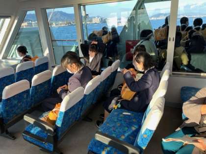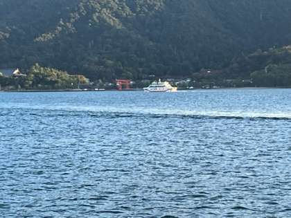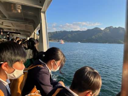 フェリーの中です。穏やかな天候のなか、デッキで過ごしていても気持ちがよいです。遠くに、厳島神社の大鳥居が見えてきました。