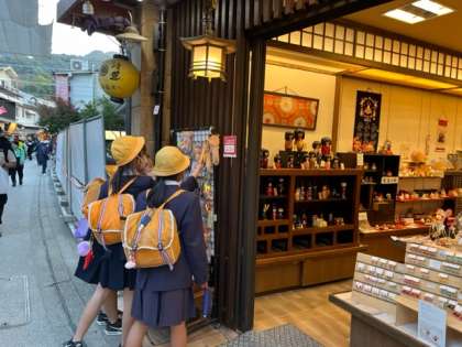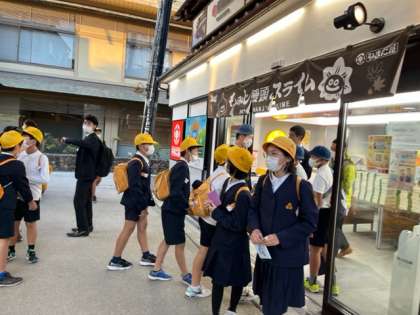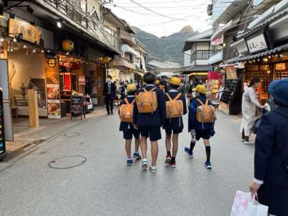 みんなで宮島の商店街へ向かいました。宮島のメインストリートでもある「宮島表参道商店街」は約350mの通りで、宮島杓子や宮島彫といった民芸品や土産物店、宮島の名物グルメが味わえる店、もみじ饅頭店などが軒を連ね、宮島ならではの風情が漂います。