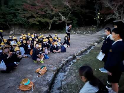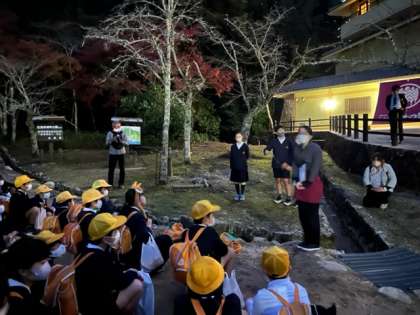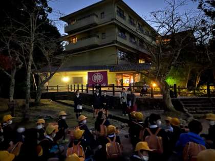 本日の宿泊場所「みやじま杜の宿」に到着しました。宿舎の前で開舎式を行い、ホテルの方々に「お世話になります」「よろしくお願いします」という気持ちを伝えました。