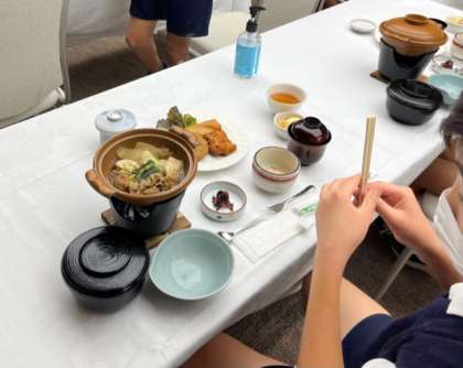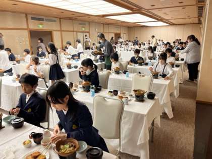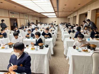 お待ちかねの夕食の時間です。児童代表の「いただきます」の声とともに、それぞれの箸が動き出しました。みんな、おいしそうに食べています。