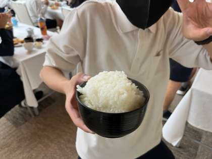 おいしそうに食べる子どもたち。お米がとてもおいしく、ごはんのおかわりが続出です。