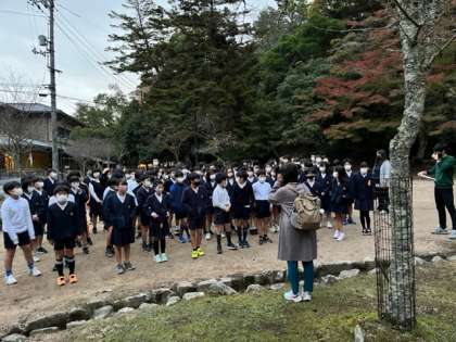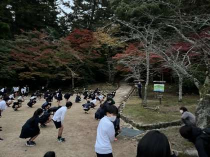 ホテルの前で朝の会を行いました。校長からの挨拶のあと、みんなで体操をして身体を動かしました。今日もかんばって、活動を楽しみましょう。