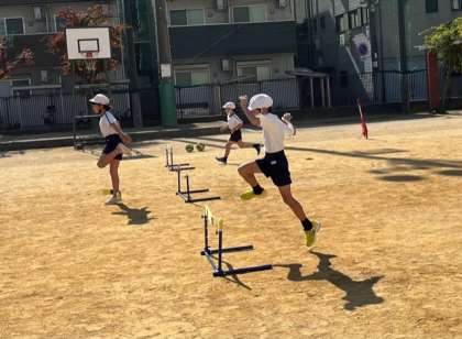 青空のした、3年生はハードルに取り組みました。軽快にジャンプしてハードルを越えていました。