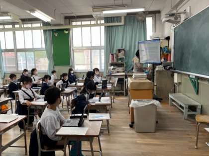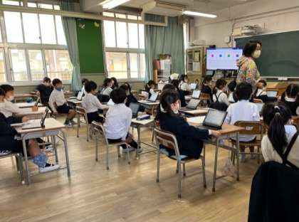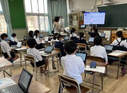 1年生は新しいパソコンを使っての学習がはじまりました。まずはパソコンを立ち上げる、使い方に慣れるところからスタートです。