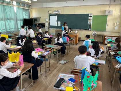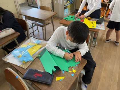 厚紙を切り抜き、窓やドア、階段などがある建物をつくりました。個性的な家やビルがたくさんできあがりました。友だちと見せ合うことも楽しんでいました。