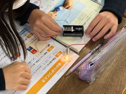 乾電池と豆電球をどのようにつなぐと明かりがつくのかを考えていきました。線のつなぎ方で変わるのか、実際にやって確かめました。