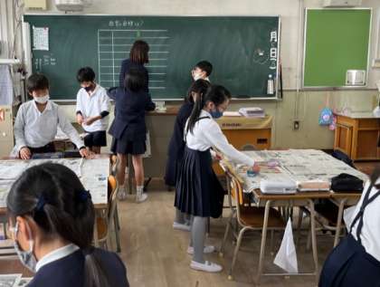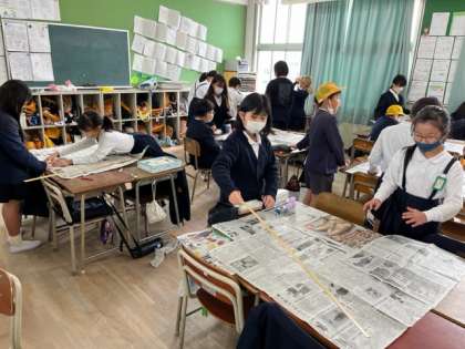 長い物差しと新聞紙を使って、教室の面積を調べる学習です。学級全体で協力して取り組んでいました。