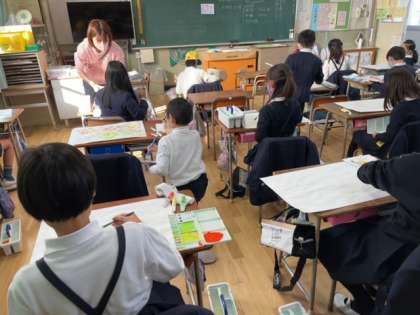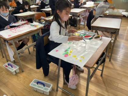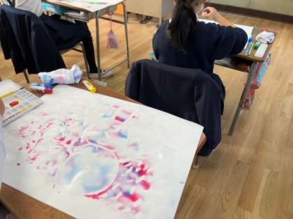 まず、パスを使って絵を描き、そのうえに絵の具をぽたぽたと落とすように色をつけていきます。パスは水分をはじくので、それにより味わいのあるデザイン画ができあがっていきました。