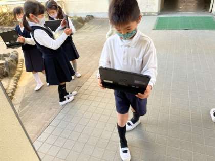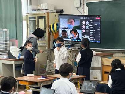 昨日に引き続いて、1年生のPC活用の様子のご紹介です。学校内ではありますが、教室から離れた場所からオンラインで教師の友だちと会話をする取組みをしました。とても楽しそうです。