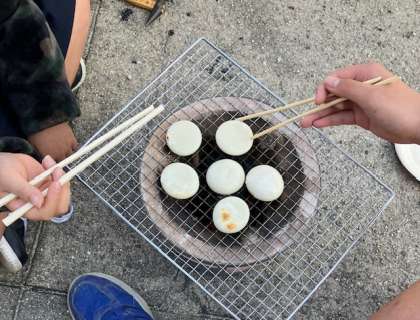 今日のなかよしタイムでは、新年の恒例となっているモチ焼きをしました。七輪に火を起こしておもちをのせると、こんがりとおいしそうに焼きあがりました。みんな、嬉しそうに頬張っていました。