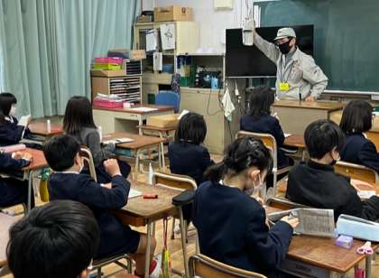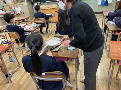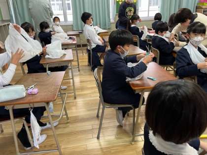 3年生は新聞紙で防災用のスリッパをつくりました。そのスリッパで石がしきつめられた場所を実際に歩いて、役にたつことを実感してもらいました。また、レジ袋を使ったケガの対処方法も教えてもらいました。