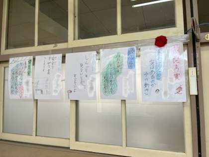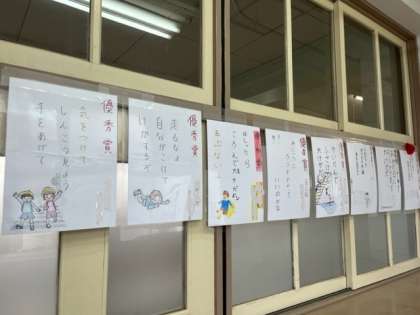 安全委員会から全校児童に呼びかけて集まった安全標語の優秀作品がポスターになりました。北館の1階の廊下に掲示しています。みんな、これを見て校内でも校外でも安全に過ごす意識を高めてもらいたいと思います。