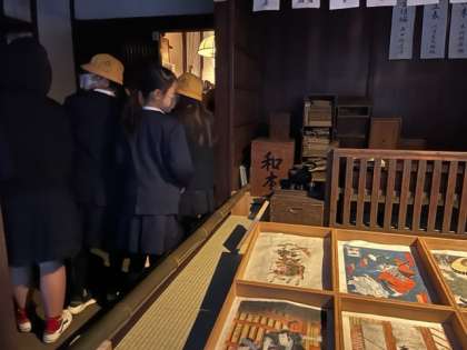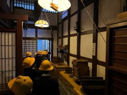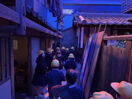 商店や家屋、屋根の上にある火の見やぐらなど、再現された江戸時代の大阪の町を体感しました。昔の生活の様子をみんな興味深く見学していました。