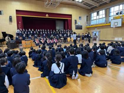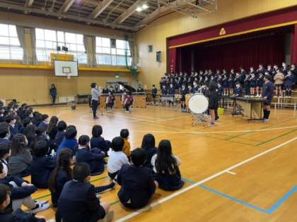 先日の学習参観の際に6年生が保護者の皆さんに披露した楽器演奏を、他学年の子どもたちが聴く機会をつくりました。頑張って練習を重ねてきた6年生の演奏が終わると、講堂は大きな拍手につつまれました。