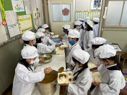 本日の1年生の給食の準備の様子です。みんなが大好きなカレーライスとイチゴ、キュウリとコーンのサラダでした。