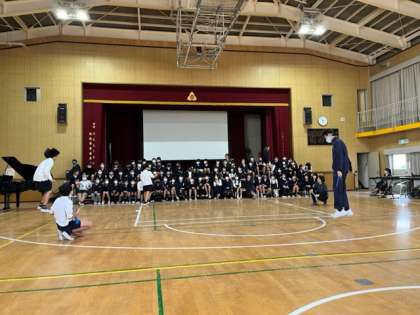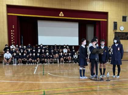 卒業を間近にひかえた6年生が、本校のすべての教職員を招待するかたちのイベント「茶話会」を催してくれました。クイズやなわとび対決などのゲームで児童と教職員が交流し楽しい時間を過ごしました。6年間の思い出を伝えてくれたあと、演奏と合唱のプレゼントもしてくれました。6年生のみんなに感謝です。
