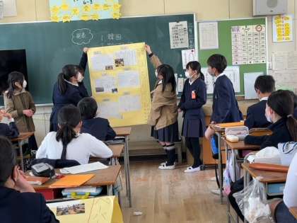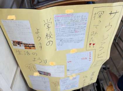 4つのグループに分かれて、韓国、サウジアラビア、アメリカ、中国について、学校や産業、生活などについて調べました。その結果を模造紙に書いたり貼ったりして発表資料としてまとめ、みんなの前でプレゼンテーションを行いました。