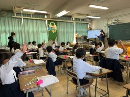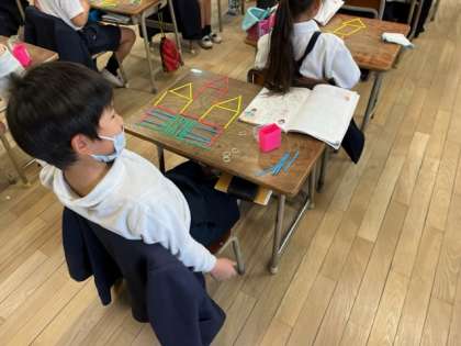 色の棒を使って、三角形や四角形の図形をつくり、それを組み合わせて物の形にしました。お城や電車など楽しい形ができあがりました。