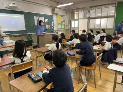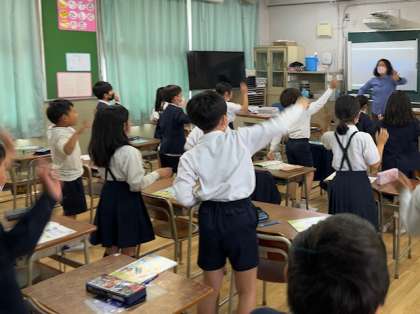 新しく今津小の担当になった外国語指導の先生と楽しく学習をしました。ヨーロッパ、アメリカ、アジアの各国の現地語のあいさつをボディアクションとともに話しました。