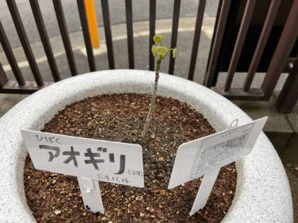 昨秋、広島平和記念公園より分けてもらったアオギリが芽吹きました。暖かな陽ざしと子どもたちの平和への願いによってさらに成長してくれるものと思います。
