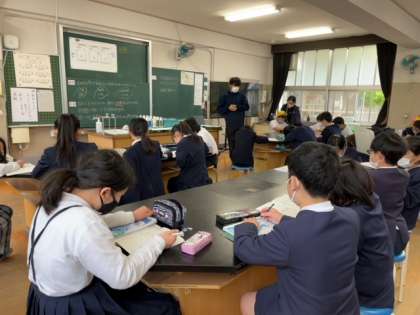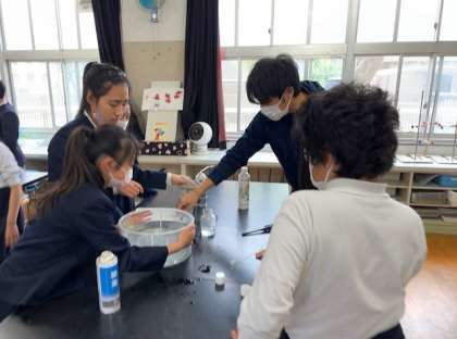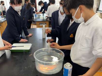 空気中にある、ちっ素、酸素、二酸化炭素のうち、ものを燃やすはたらきのある気体はどれかを確認する実験を行いました。実験結果をしっかりとノートに書きとめることができていました。