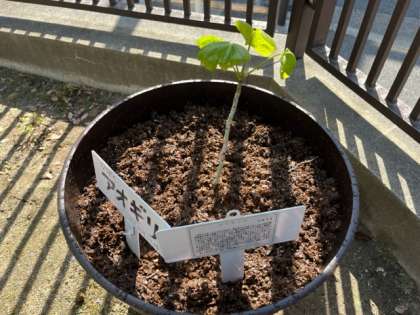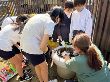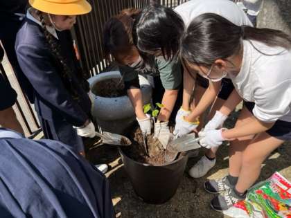 広島から持ち帰ったアオギリが成長したため、底の深いプランタに引っ越しさせることにしました。今秋に修学旅行で広島へ行く6年生の栽培委員に「被ばくアオギリ」について紹介したうえで、子どもたちの手で植え替えてもらいました。