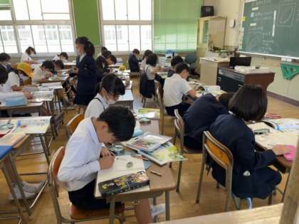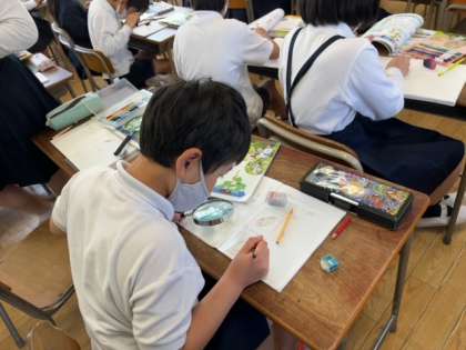 ヘチマの種とヒョウタンの種をルーペを使ってじっくりと観察をしました。それぞれの形状や特徴をしっかりとノートに書き写しました。