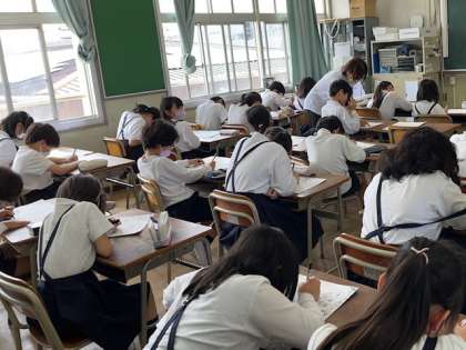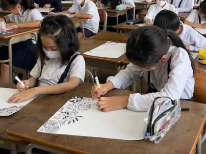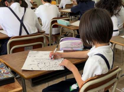 黒い線を使って、自分なりの世界を表現していきます。線を描くときの約束として「ゆっくり」「はっきり」「一度きり」を先生から伝えられ、そのことを意識しながら丁寧にペンを動かします。
