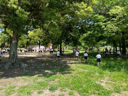 楽しく遊具で遊び、待ちに待ったお弁当タイムです。グループごとに「いただきます!」の元気なかけ声で食べ始めます。みんなで食べるお弁当、おいしかったですね!保護者の皆様、お弁当のご準備ありがとうございました。食後にはゴミ拾いをして、遊具で少し遊びました!電車内、緑地、昼食とマナーよく、素敵な2年生でした!
