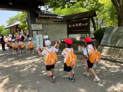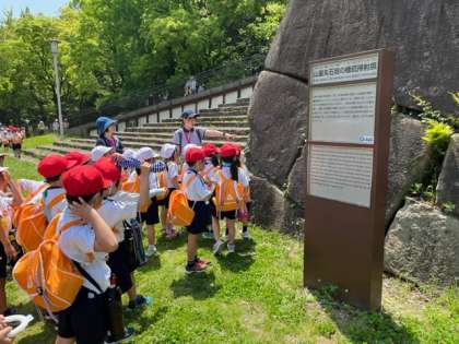 散策の途中、大阪城の石垣に残る太平洋戦争の砲弾の傷跡について先生から教えてもらいました。暑さをしのぎ休憩もをこまめに取りながら足を進め、西の丸庭園に到着です。
